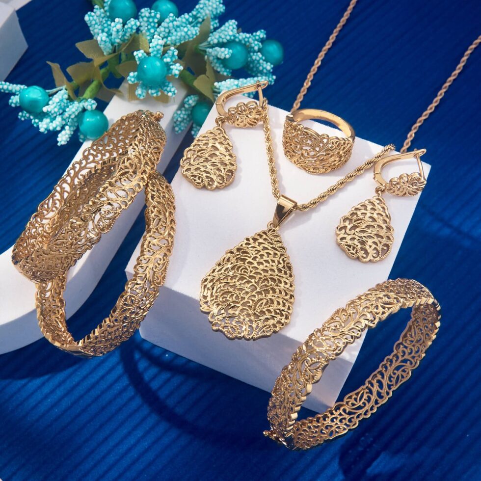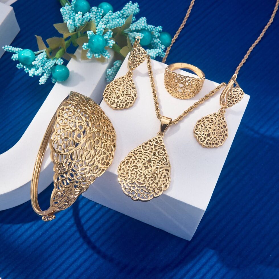 Filigree Leaf Full Set (Bangle + Pendant + Earrings + Ring). Coordinated jewelry set for a complete look.