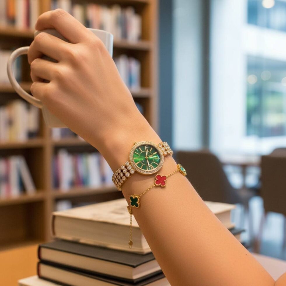Green Dial Watch + Clover Bracelet. Elegant accessory set suitable for everyday wear and gifting.